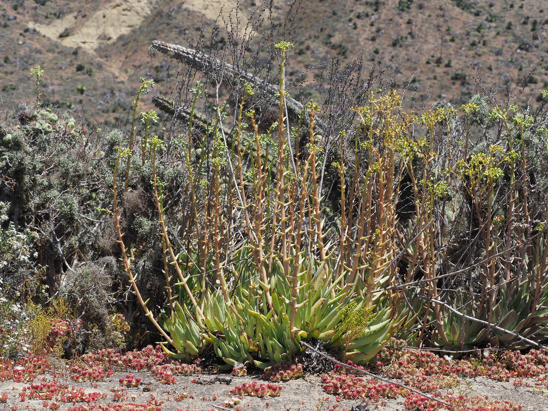 Dudleya species north of El Rosario. The reddish plant is Mesembryanthemum crystallinum is in foreground and is invasive/naturalized along coastal strip in Baja California.