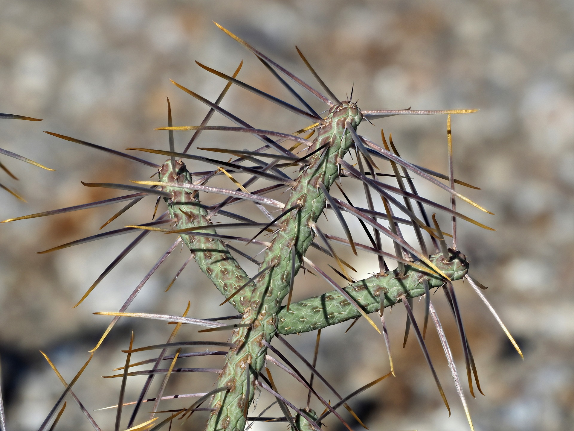 A closer view of Cylindropuntia ramosissima in the Anza-Borreo Desert State Park. The spines are very long compared with the thickness of the stems. The stems are quite thin. A common name is “Diamond Cholla” since the tubercles (raised parts on the stems) have a diamond shape.
