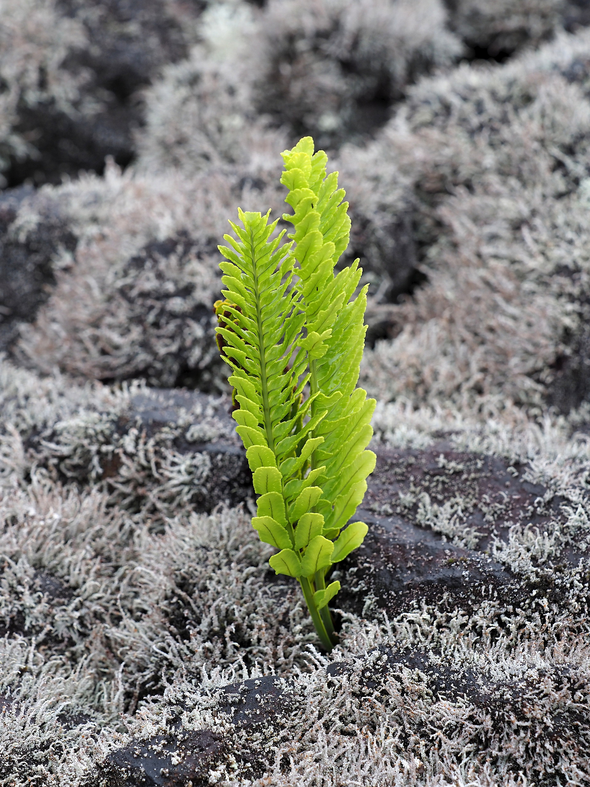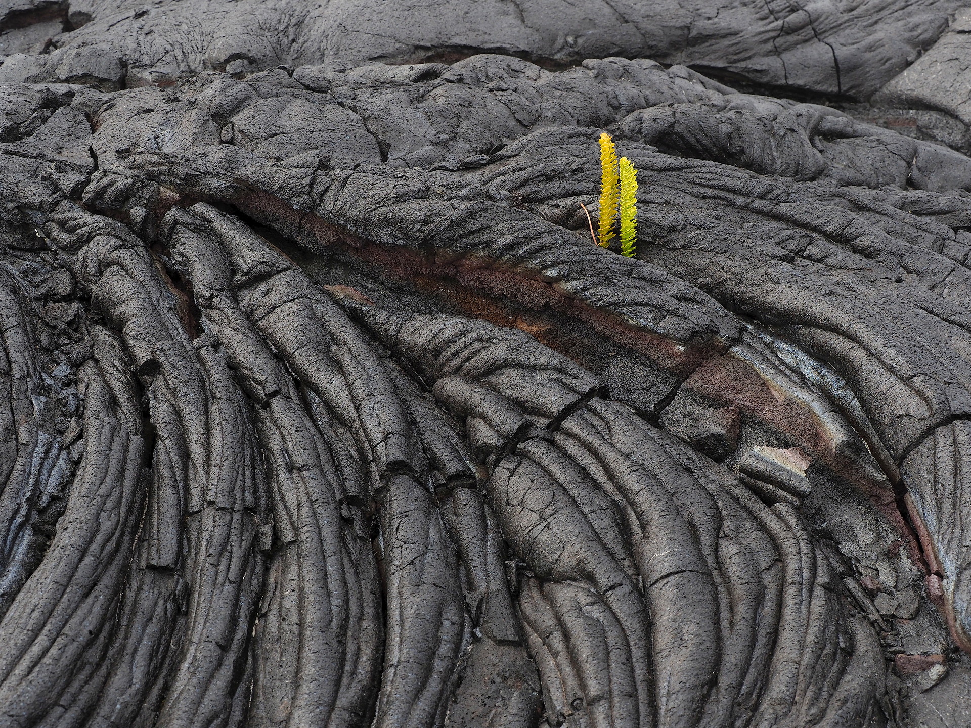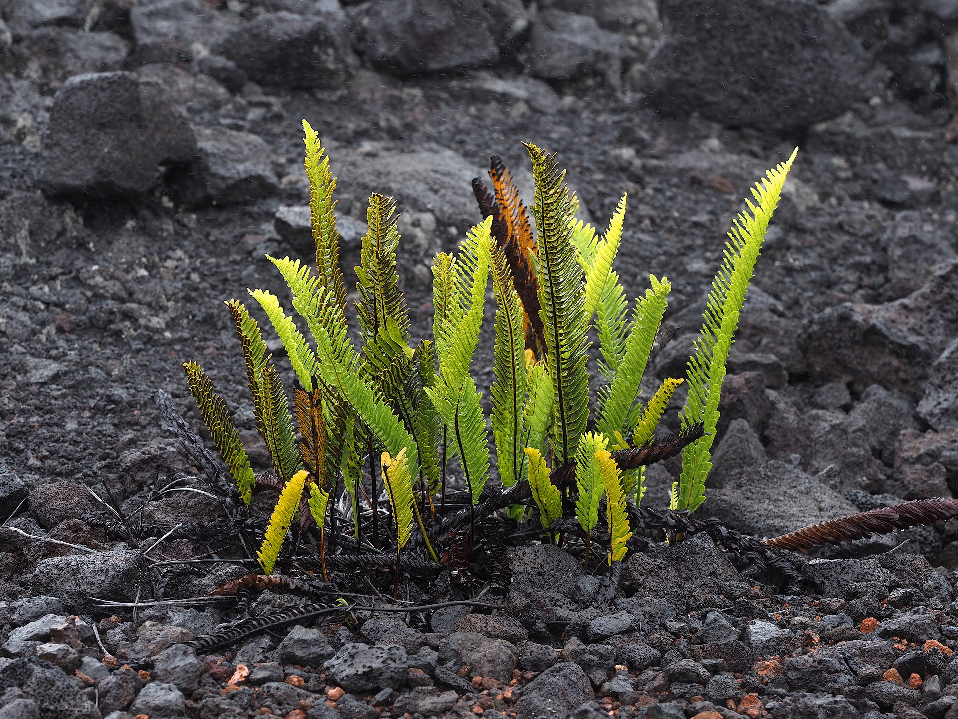 The first plants to colonize very recent lava flows are usually ferns (lichens come even earlier). These are followed by some Lycopodiums (Club mosses) and then Ohia trees. The Ohia can flower while still small shrubs, yet they can eventually grow to trees of 50 ft height or more on older kipukas with developed soils.