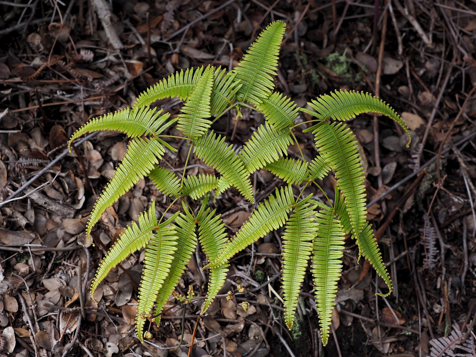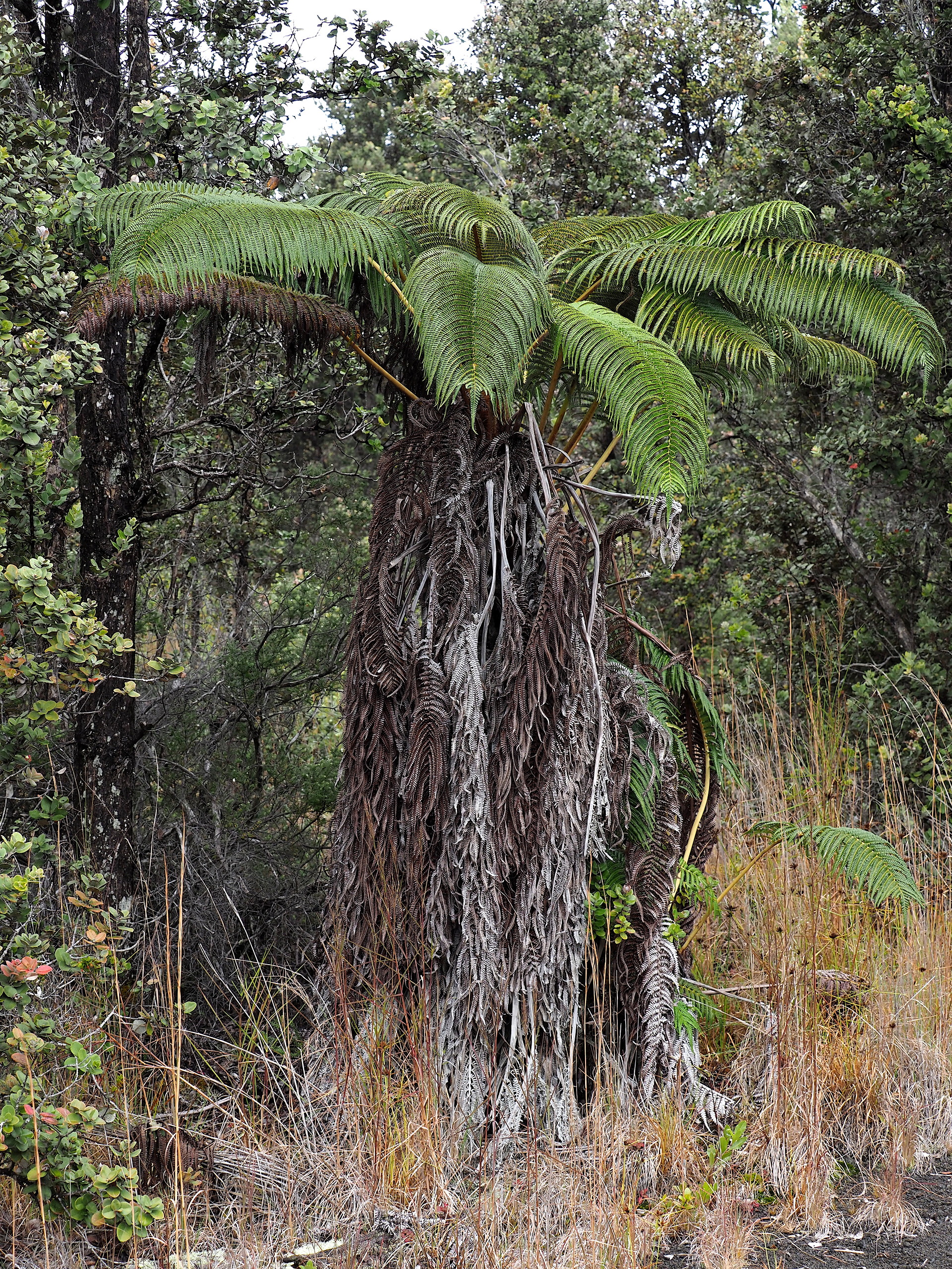 One fern, abundant on all of the islands, is the Dicranopteris linearis. It has an interesting dichotomous branching pattern and is a pioneer species and spreads across disturbed landscapes and can even grow vertically against trees. After it dies it retains the basic network of vascular tissue and traps organic materials to help further soil development. Other ferns that are very prominent in Hawaii include the tree ferns of the genus Cibotium and Sadleria. The latter has an interesting growth character in that young fronds are reddish, only turning green with age. There are a handful of different species in each of these genera but the non-specialist probably will have difficulty identifying them.