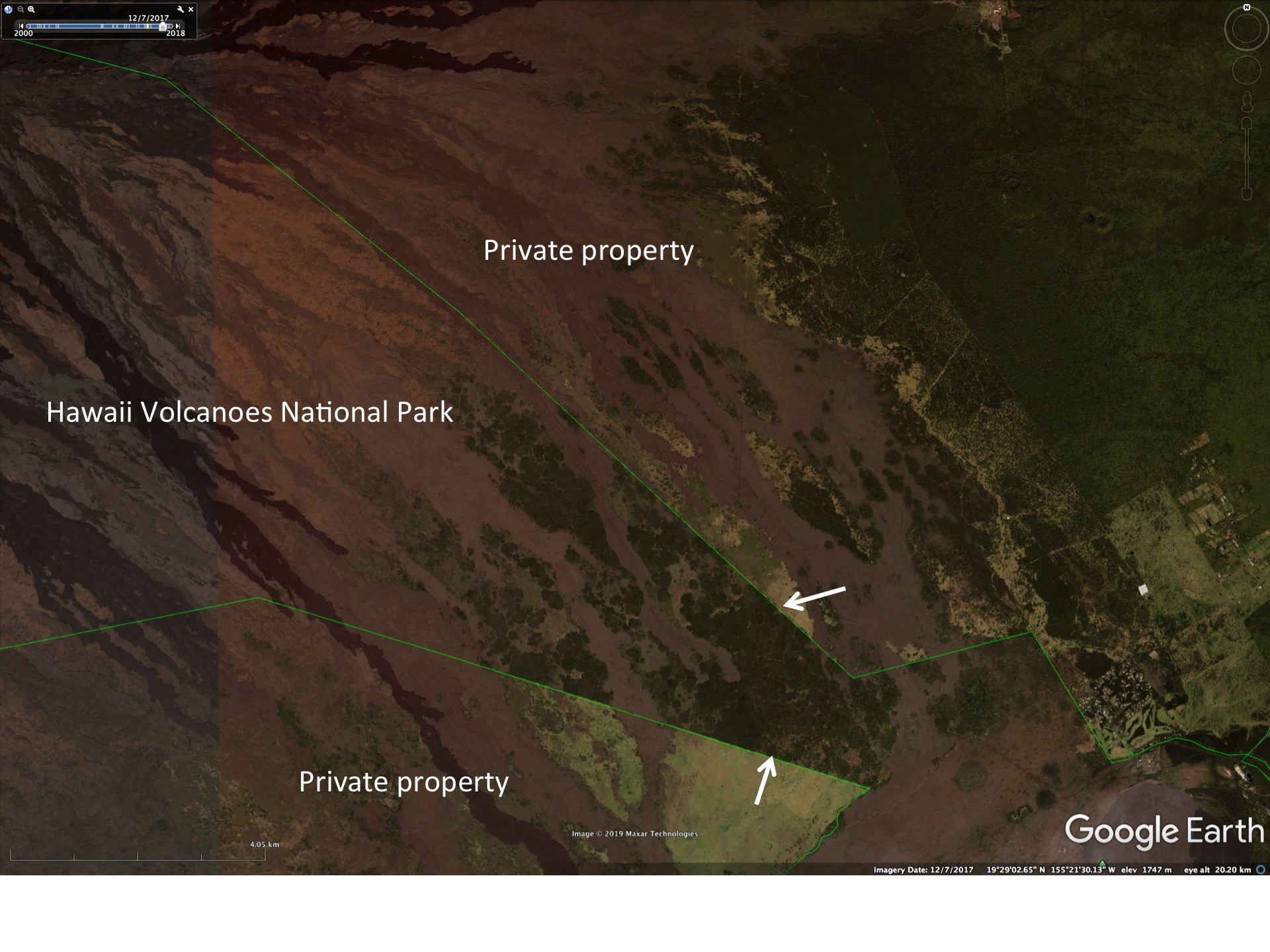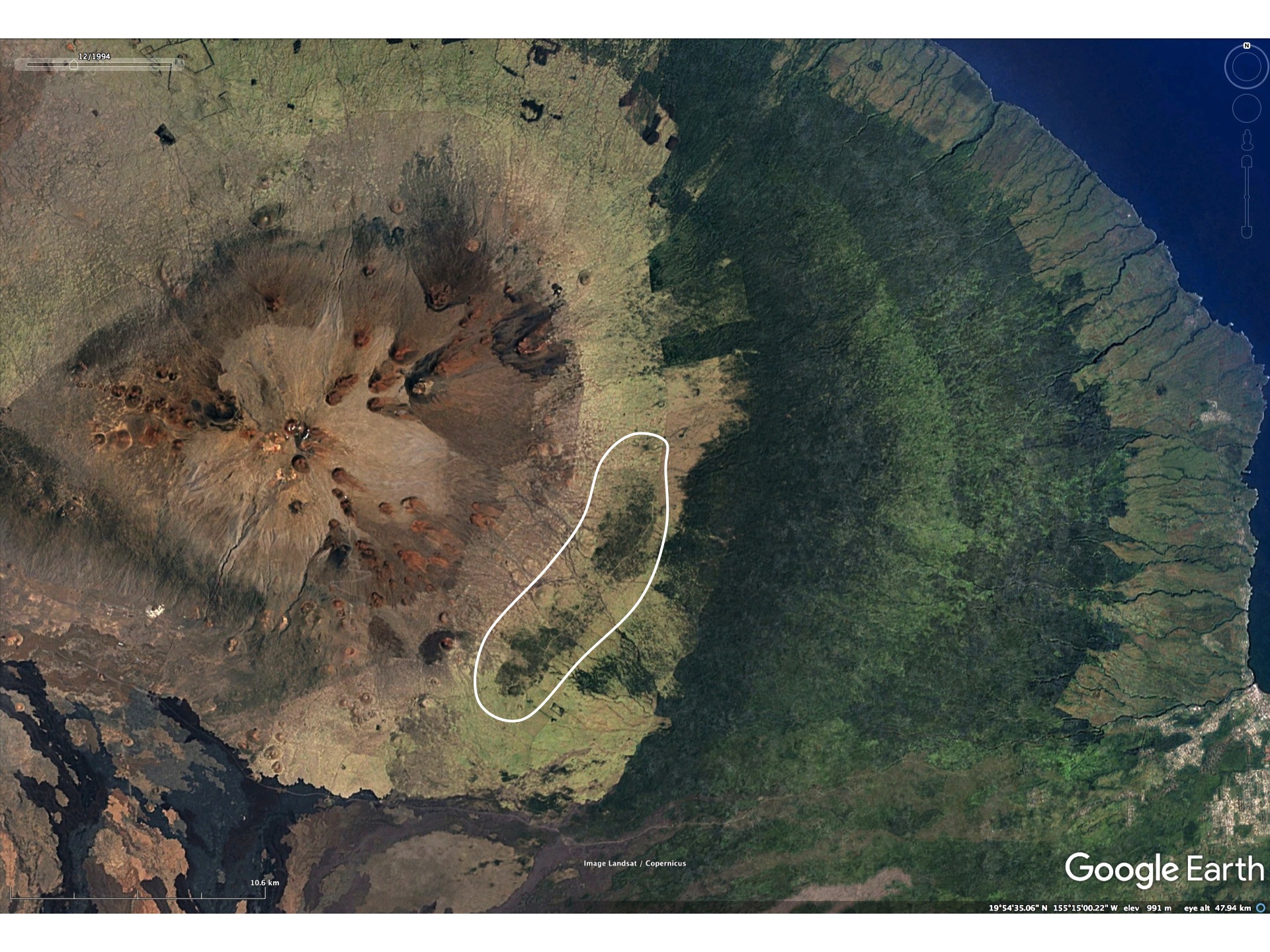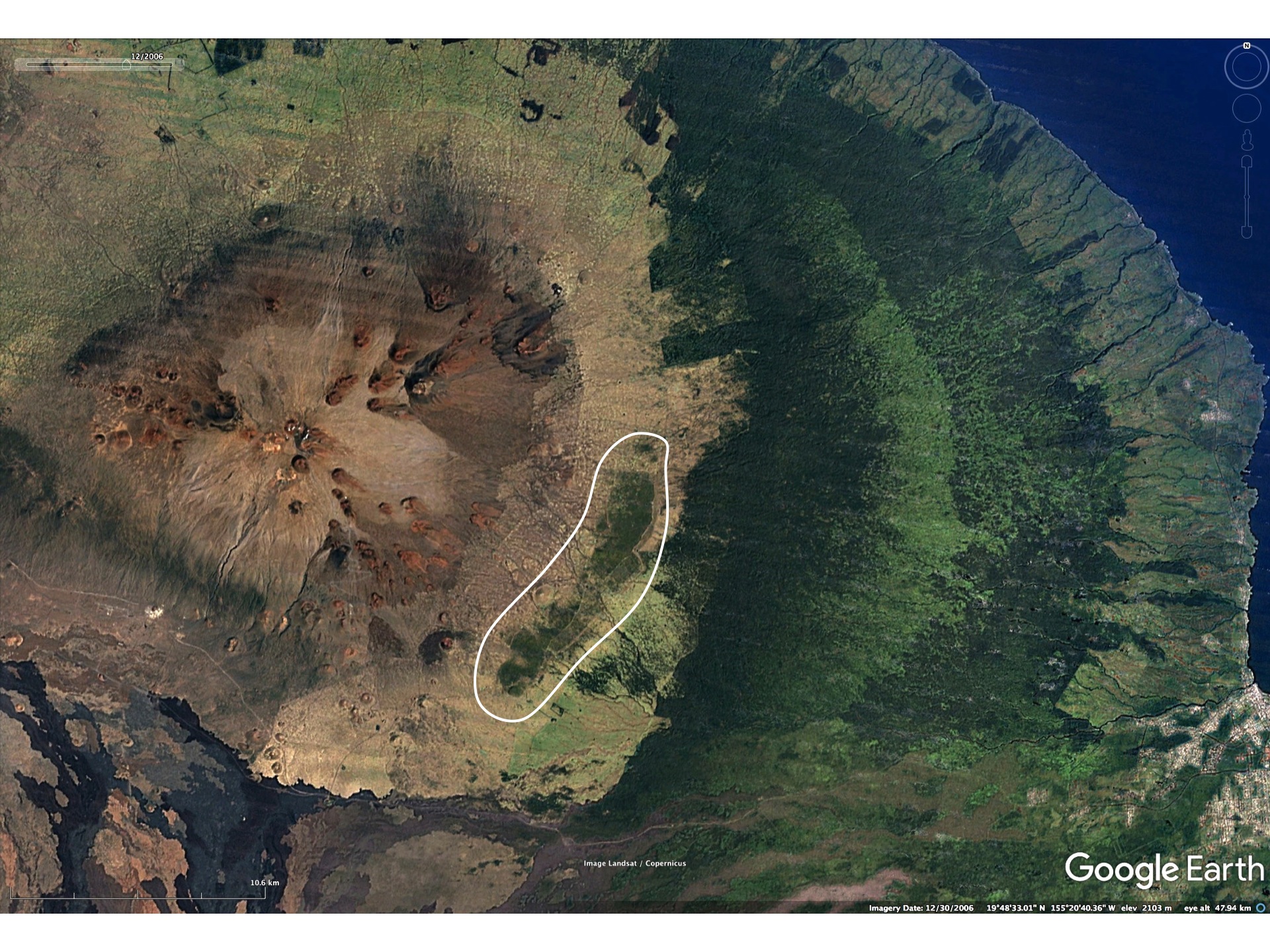 One of the most apparent aspects of the natural vegetation cover for a naturalist is the effect of the lava flows on moist forests. A fresh lava flow is the ultimate “disturbance”, completely covering over the underlying vegetation and making inaccessible to wind-borne seeds any soil that might have developed since the last lava flow. High rainfall areas that have not been covered by lava flows in hundreds of years have time to develop substantial forests with tall trees and these often isolated patches of forest among otherwise barren landscapes have the Hawaiian term “kipuka”. One self-guided nature trail close to the visitor’s center in Hawaii Volcanoes National Park goes through an old Kipuka with many tall trees. Other kipukas are evident on the Mauna Ulu trail and elsewhere. A sampling of kipukas is shown in this powerpoint that we prepared from screen captures of Google Earth imagery.