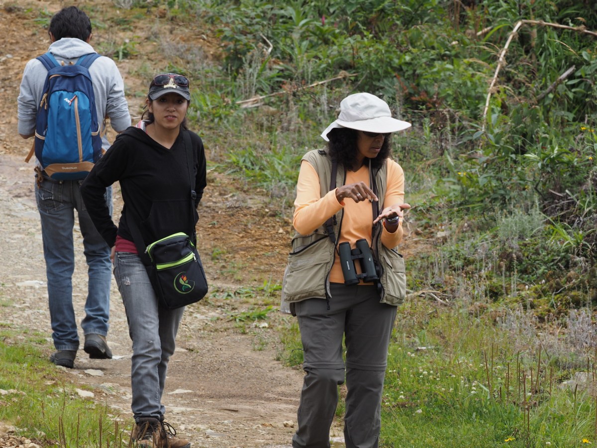 A not very good photo – Rosario (in front) points out an insect in her hand, but the person behind (Andrea Soliz – the organizer of the tour) is looking at me – even though I use a telephoto lens … una foto no muy buena – Rosario (al frente) señala un insecto en su mano, pero la persona detrás (Andrea Soliz – la organizadora de la gira) me está mirando a mi – a pesar de que utilize un teleobjetivo …