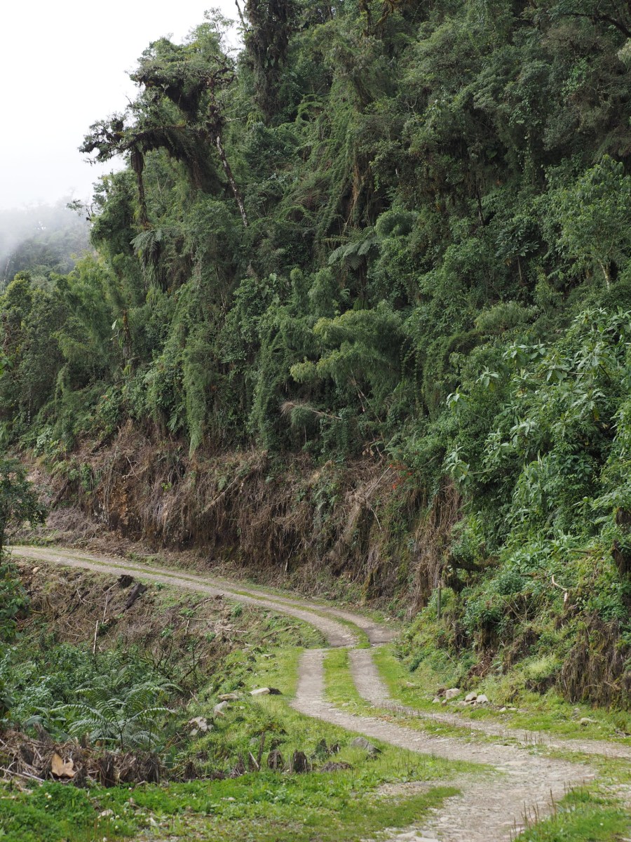 The subject here is the road cutting through the Yungas forest and the damage to the vegetation on the side of the road. El tema aquí es el camino que atraviesa el bosque de Yungas y el daño a la vegetación en el lado de la carretera..