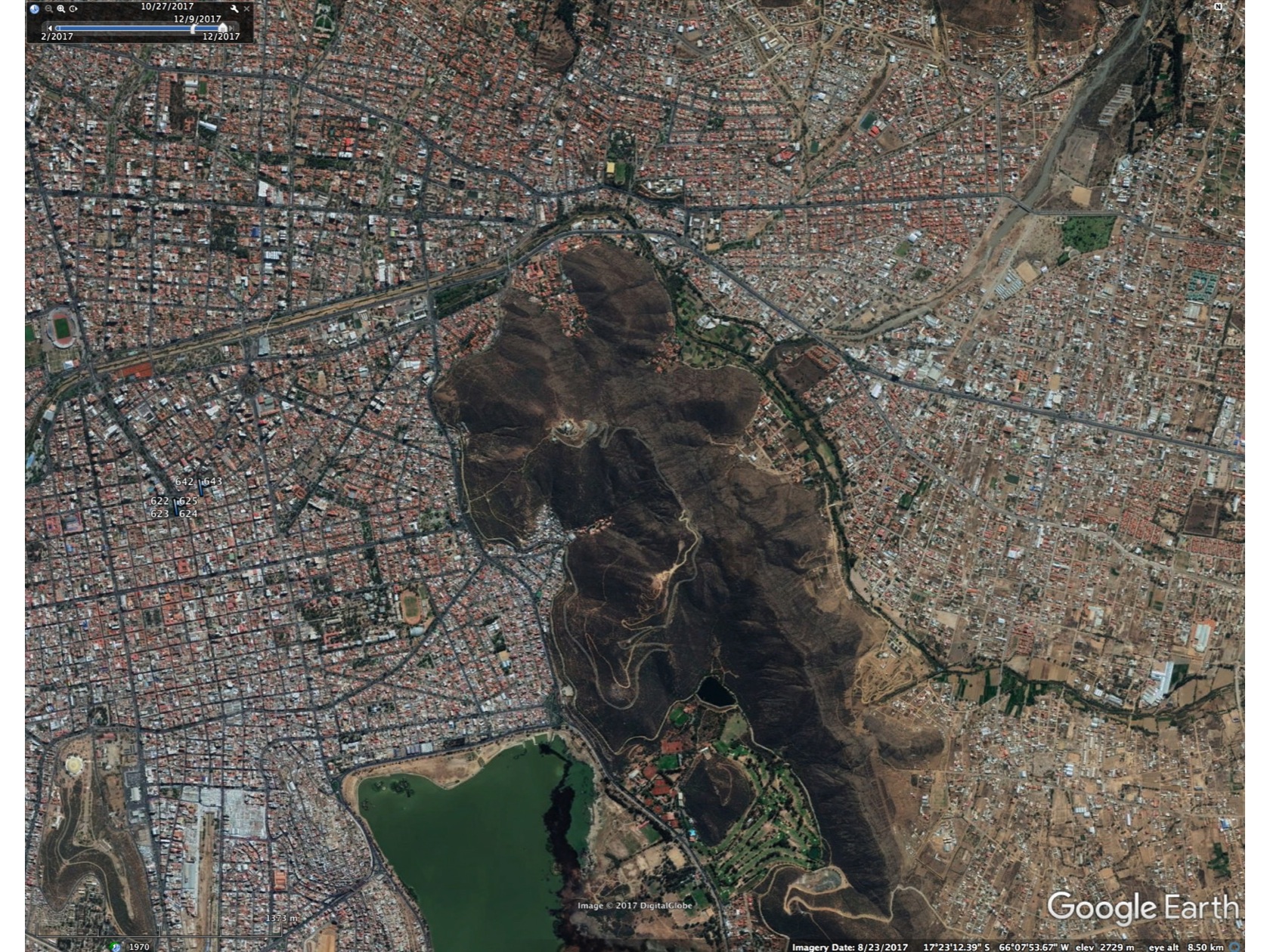 Después de regresar de la visita a los Yungas, un pequeño grupo decidió visitar el Cerro San Pedro, arriba de la ciudad de Cochabamba. La motivación fue ver los cactus en la colina y otras plantas adatadas a la aridez no evidente en el viaje de los Yungas. Debo decir que Rosario y yo quizás iniciamos esta visita, dado nuestro interés en los cactus, pero Andrea Soliz también se interesó en acompañarnos. Anteriormente ella llevo a cabo unos estudios sobre las cactaceas en el Cerro con otros estudiantes …Dos vistas de Google Earth de Cerro San Pedro están debajo; una muestra todo el Cerro y la carretera, mientras que la segunda muestra dónde caminamos en el breve tiempo que estuvimos en la colina.