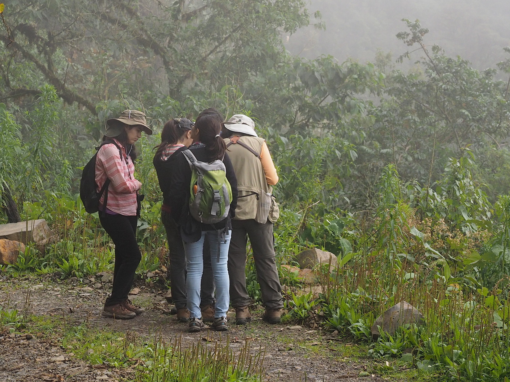 Fig 3e una foto no muy buena – Rosario (al frente) señala un insecto en su mano, pero la persona detrás (Andrea Soliz – la organizadora de la gira) me está mirando a mi – a pesar de que utilize un teleobjetivo …