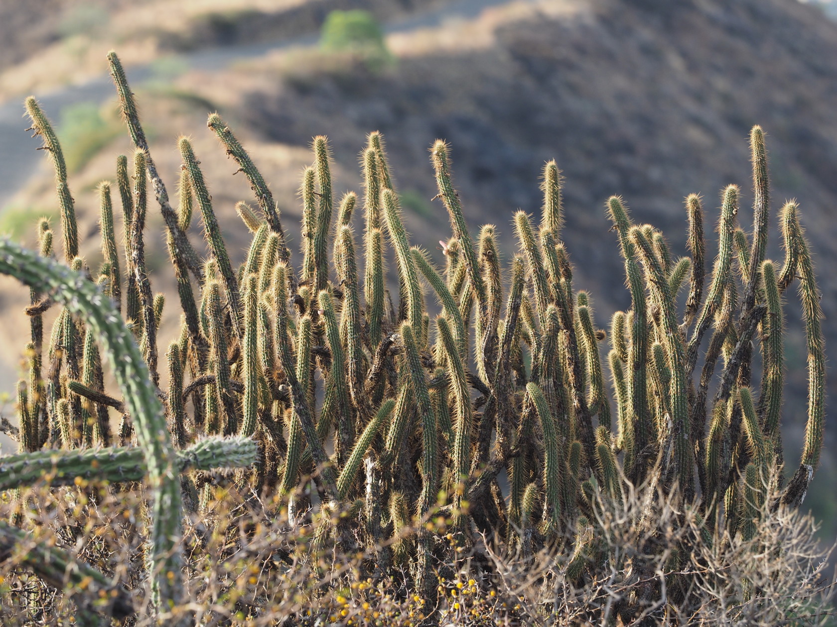 Nuestra visita fue necesariamente corta, tanto por la luz del sol limitada como porque el camino hacia el Cerro se cierra a una hora específica y solo teníamos unos 30 minutos disponibles para nuestra visita. Nos detuvimos cerca del Cerro con la estatua de Cristo, y caminamos por un sendero que otros claramente habían usado para otros propósitos, ya que el papel higiénico era bastante evidente. Más allá, el camino estaba más limpio. Encontramos una diversidad razonable de cactus y algunas otras suculentas en las laderas del Cerro San Pedro, especialmente dado el poco tiempo disponible para la búsqueda. Las grandes Cereus hankeanus, Harrisia tetracantha y Cleistocactus parviflorus eran numerosas, y entre los arbustos tenemos muchas Echinopsis. En las rocas habia pequeñas Parodia. Opuntia sulfurea y Tacinga tipo Opuntia también fueron evidentes. También se presentaron Agave y Opuntia ficus-indica. Entre las Bromeliaceae había una especie de Puya y varias Tillandsia, sin duda, había más plalntas que no vimos.