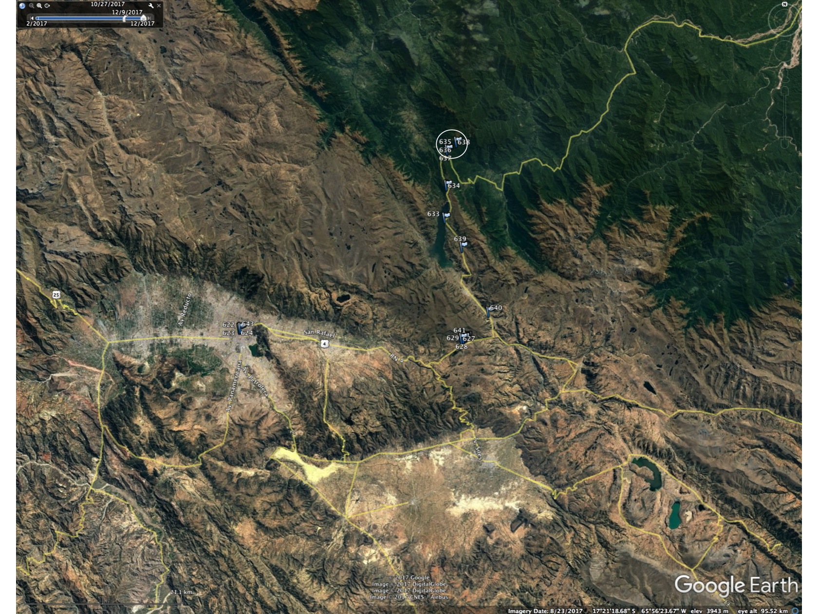 Primero comenzamos describiendo la ruta al camino del bosque nuboso.Las siguientes figuras, tomadas de Google Earth, muestran la carretera principal que conecta Cochabamba con las evelaciones más bajas hacia el norte (y eventualmente Santa Cruz de la Sierra). La figura 1 muestra el cambio dramático en la vegetación (de marrón a verde) a medida que uno avanza hacia el norte. La elevación más alta en el camino es de aproximadamente 3650 metros, las condiciones rapidamente se vuelven más humedas a medida que se desciende hacia el norte. El conductor del autobús se detuvo en un sitio conocido por los estudiantes; caminamos por un camino de tierra durante aproximadamente 3 horas. Esta carretera no tenía tráfico. El camino estaba aproximadamente nivelado, cortándose en una pendiente pronunciada, con una elevación de aproximadamente 2800 metros.